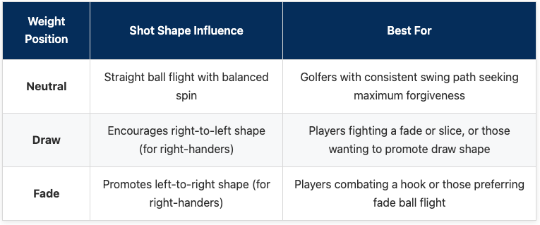 - Shot Shape Control: Three positions (Neutral, Draw, Fade) allow precise flight tuning