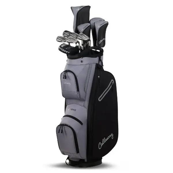 The Callaway REVA Black/Grey 11-Piece Cart Package Set is a comprehensive collection of clubs designed to maximise distance and forgiveness throughout the entire bag. The set is anchored by an innovative driver that uses a composite crown to optimise weight, paired with easy-to-launch fairway woods and oversized deep cavity back irons that ensure a high-flying ball flight. Completing the performance package is a tour-proven Odyssey Stroke Lab putter and a functional cart bag,