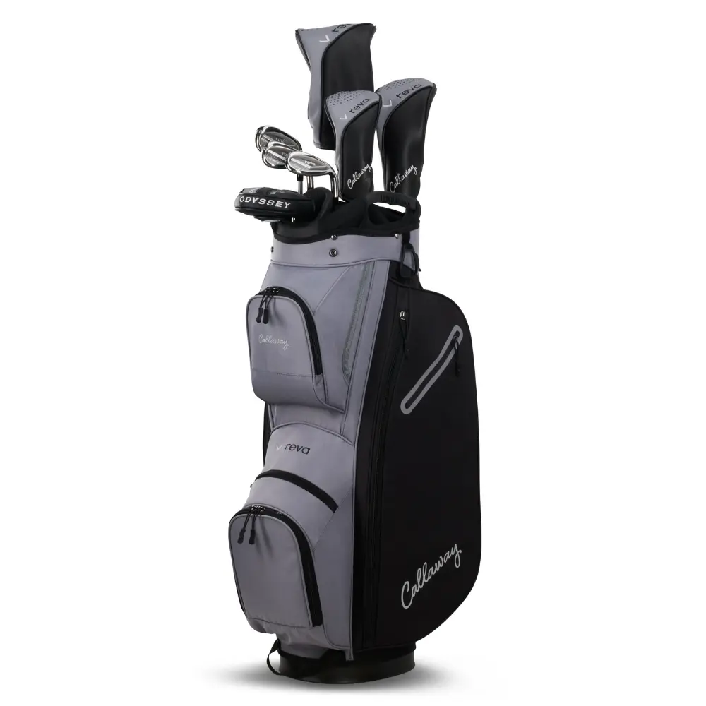 The Callaway REVA Black/Grey 8-Piece Cart Package Set is a high-performance collection designed for women who want to increase their distance and improve their consistency on the course. This set features a driver with an innovative composite crown to maximise forgiveness and a fairway wood designed for an easy, high-flying ball flight. The irons utilise large, oversized deep cavity back designs to ensure even off-centre hits launch easily. Styled in a sophisticated black and grey finish, the set includes an Odyssey White Hot OG #7 putter and a premium cart bag providing a complete, stylish, and functional gear solution.