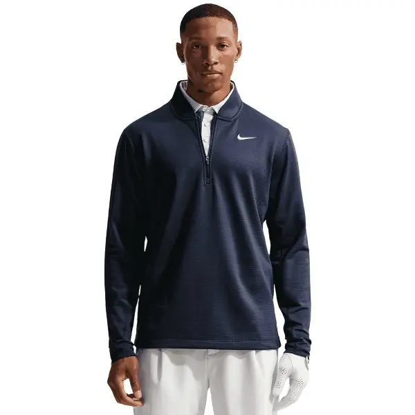 Nike Therma-FIT technology manages your natural body heat to help retain warmth in cold weather. The fabric includes stretch, allowing you to complete a full turn and swing freely. A blade collar and half-zip design make it easy to layer over your favourite polo, while the fit remains true to size and it's machine washable for simple care.