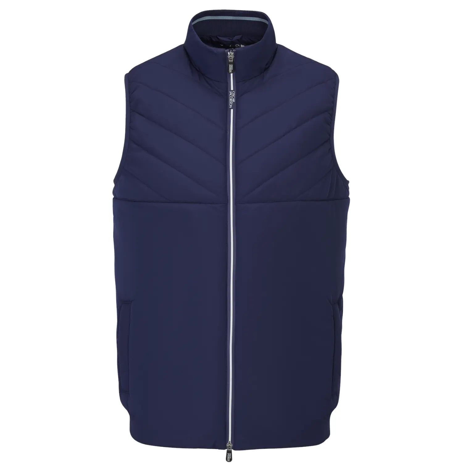 The Oscar Jacobson Lyttelton Golf Gilet is a stylish thermal layer designed for warmth and comfort both on and off the course. Made from water-repellent, windproof fabric, it features incline quilting on the chest, zippered pockets, and a half-ribbed hem for a modern look. The lightweight padding ensures excellent thermal regulation, while the two-way zip and OJ logo on the back add practical and stylish touches. Wear this mid-layer over one of Oscar Jacobson's performance golf shirts.
