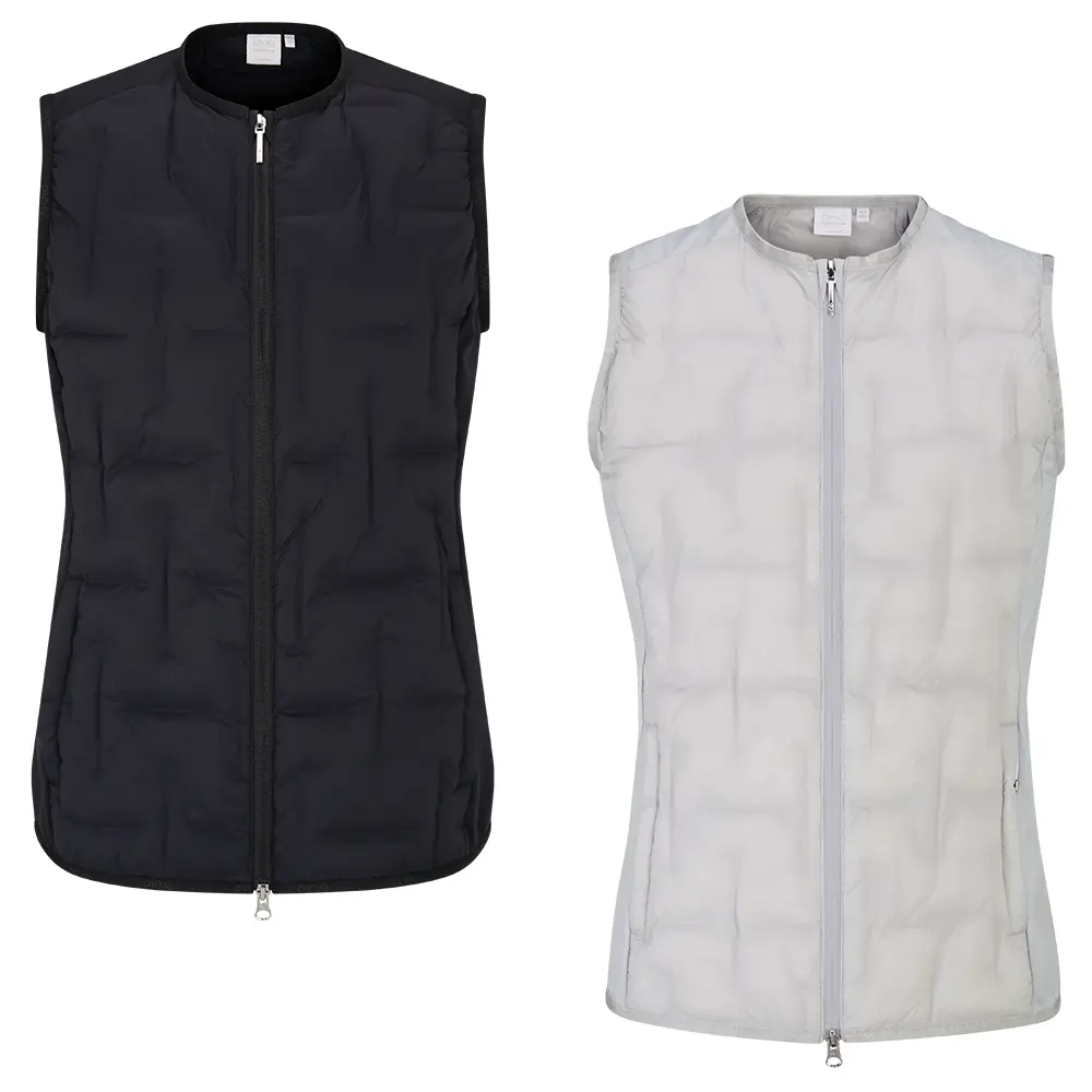 The Flo Ladies Insulated Golf Vest from Ping is an ideal layering garment and provides exceptional warmth in cooler conditions. Made with Ping's SensorWarm technology, this vest is incredibly insulating and has a stitch-free quilted design. The body panels are insulated with Sorona Aura, which is an exceptionally lightweight and breathable partially plant-based insulation, making the Flo Vest an environmentally conscious choice. The collarless design makes it less bulky around the next - perfect for layering underneath your favourite Ping golf jacket for added insulation.