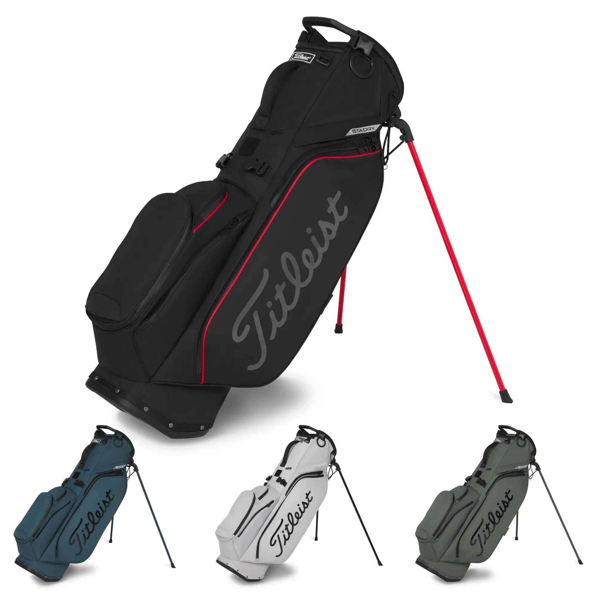 StaDry waterproof construction with seam-sealed zippers helps keep equipment dry when conditions turn poor. The redesigned stand system improves club access and stability, with a larger top cuff, full-length dividers, and a wider base supported by three stay rods. A new double strap system improves comfort and balance while carrying, supported by an integrated hip pad for longer rounds.